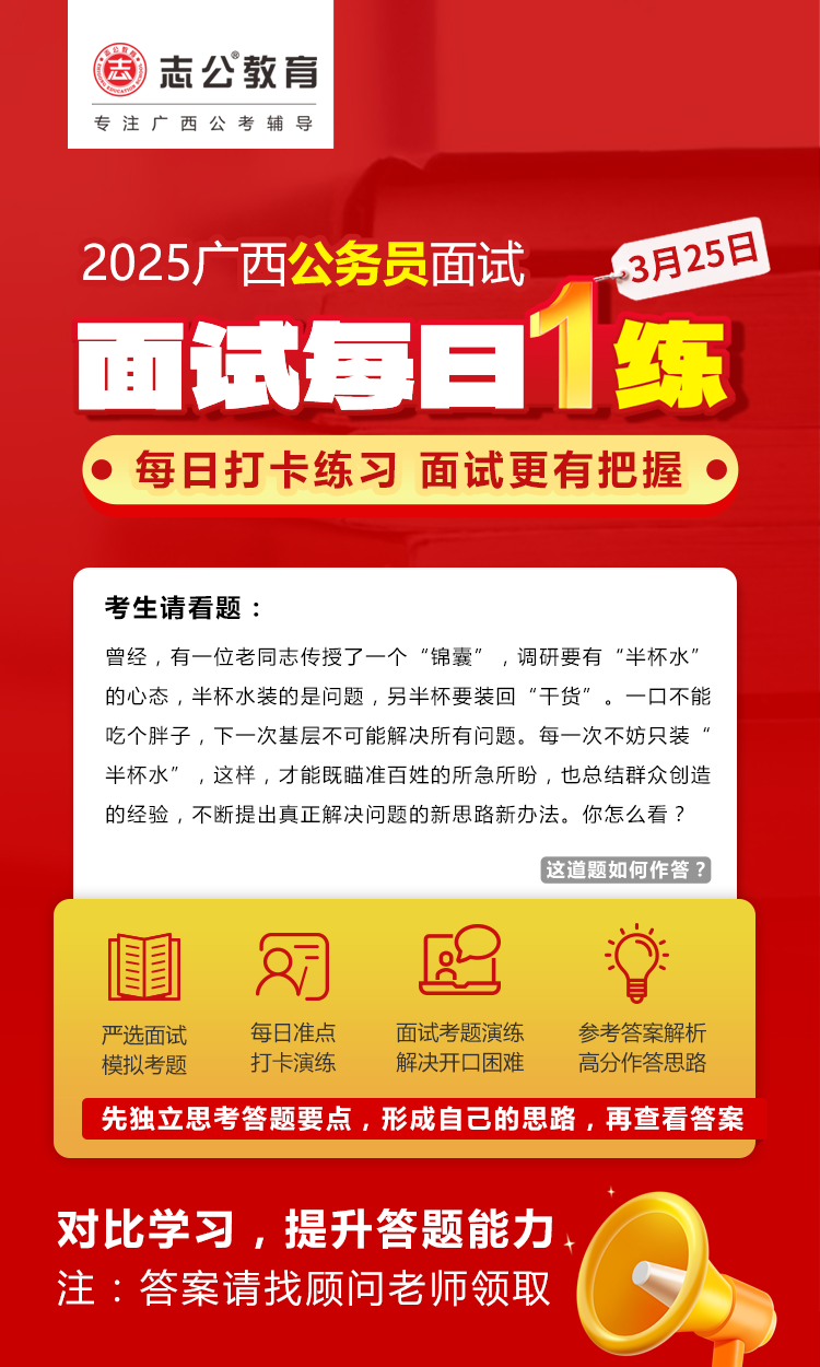 廣西區(qū)考面試準備需緊扣本土特色,強化邏輯表達和實務(wù)能力,同時注重細節(jié)(如資格復(fù)審材料、禮儀)。建議從現(xiàn)在起每天練習(xí)2-3套題,持續(xù)積累廣西熱點案例,爭取面試高分!資料已經(jīng)為大家準備好了,快去看看吧!
