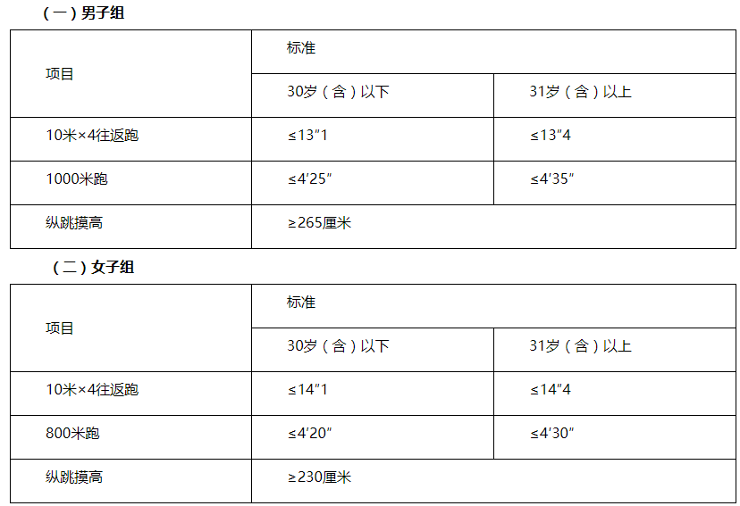 體能測評三項(xiàng)全部達(dá)標(biāo)方為合格。體能測評項(xiàng)目中,縱跳摸高的測試次數(shù)不超過3次,10米×4往返跑的測試次數(shù)不超過2次,長跑項(xiàng)目(男子1000米、女子800米)的測試次數(shù)為1次。