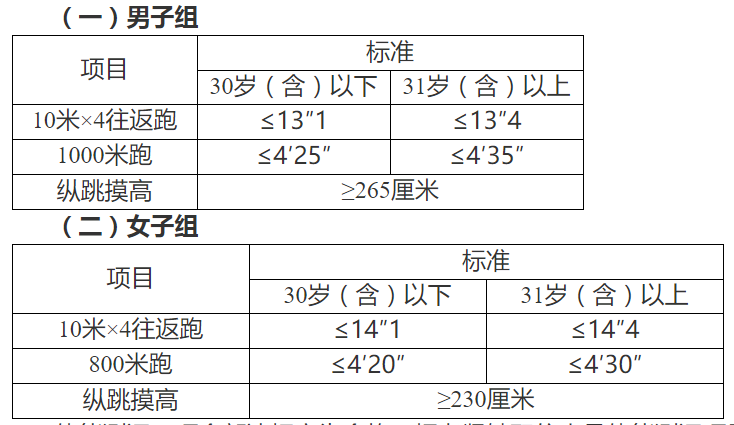 體能測評三項全部達(dá)標(biāo)方為合格。報考緊缺職位人員體能測評項目三項中有兩項達(dá)標(biāo)的,視為合格。體能測評項目中,縱跳摸高項目的測評次數(shù)不超過3次,10米×4往返跑項目的測評次數(shù)不超過2次,男子1000米跑、女子800米跑項目的測評次數(shù)為1次。