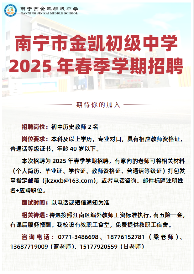 原文標(biāo)題:南寧市金凱初級中學(xué)2025年春季學(xué)期招聘
