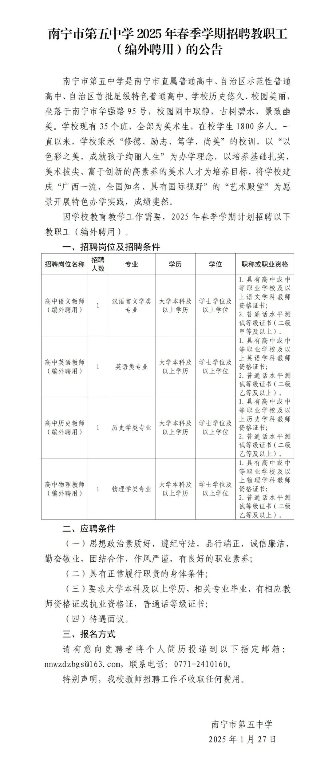 2025年南寧市第五中學春季學期招聘教職工(編外聘用)的公告