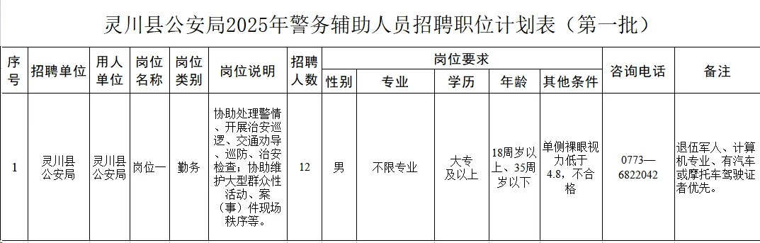靈川縣公安局2025年第一批警務輔助人員招聘12人