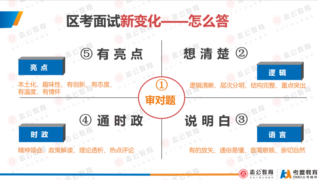 解決方法:一是進行面試脫敏??梢远噙M行考場還原和模擬,讓自己提早適應面試緊張的氛圍和節(jié)奏。二是保持良好的答題狀態(tài)考生在進入考場前,可以拿以前的模擬題或者預測題,條件允許的話可以大聲讀出來,再不濟也要默讀題目,快速思考,做到胸有成竹。三是掌握答題邏輯。思考之后心中已經(jīng)有對策的時候,可以適當預留幾秒鐘思考如何說得清楚、讓人聽得明白。四是概括題目破題切入。這是最簡單有效的方法,不需要假大空,也不需要深度思考,以題目為抓手,但注意不要直接念題干。這種答題方式,可以給考官扣題作答的感受。