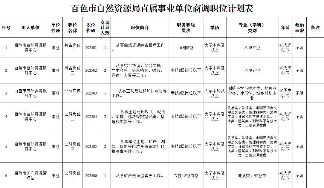 商調職位為百色市自然資源服務中心和百色市礦產資源管理站。具體職位信息詳見《百色市自然資源局直屬事業(yè)單位商調職位計劃表》。