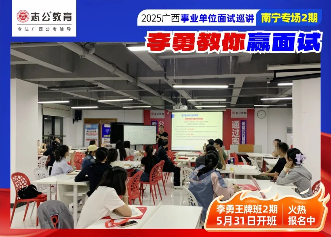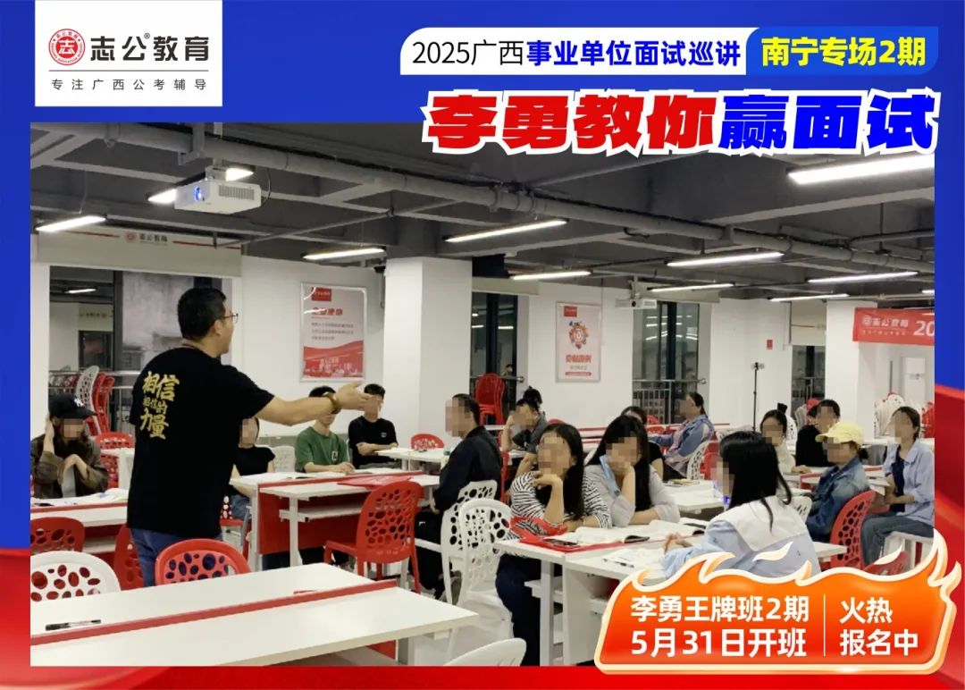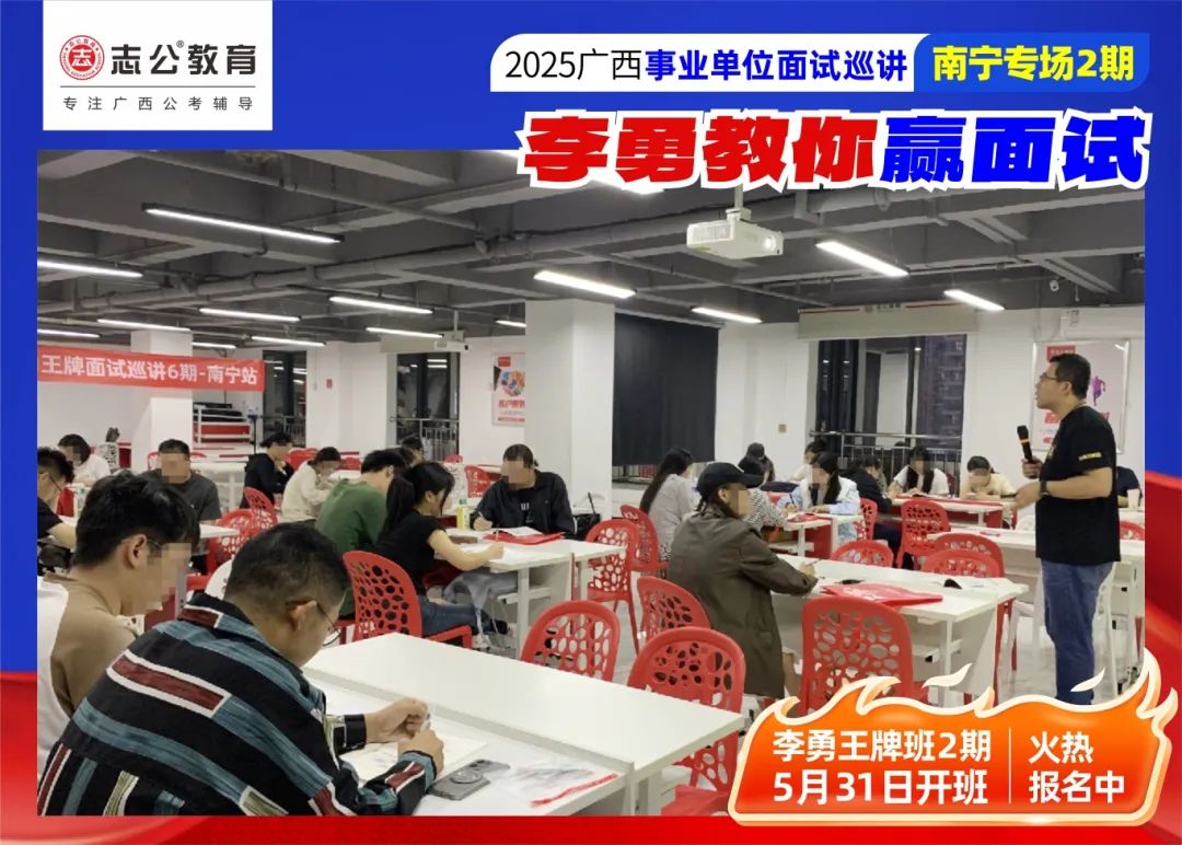 隨著2025廣西事業(yè)單位——李勇教你贏面試【南寧專場(chǎng)2期】線下巡講落幕,這場(chǎng)"面試攻堅(jiān)戰(zhàn)",不僅點(diǎn)燃了備考熱情,更讓志公教育"幫助人才實(shí)現(xiàn)更高質(zhì)量的就業(yè)"的使命,在八桂大地結(jié)出更多碩果。