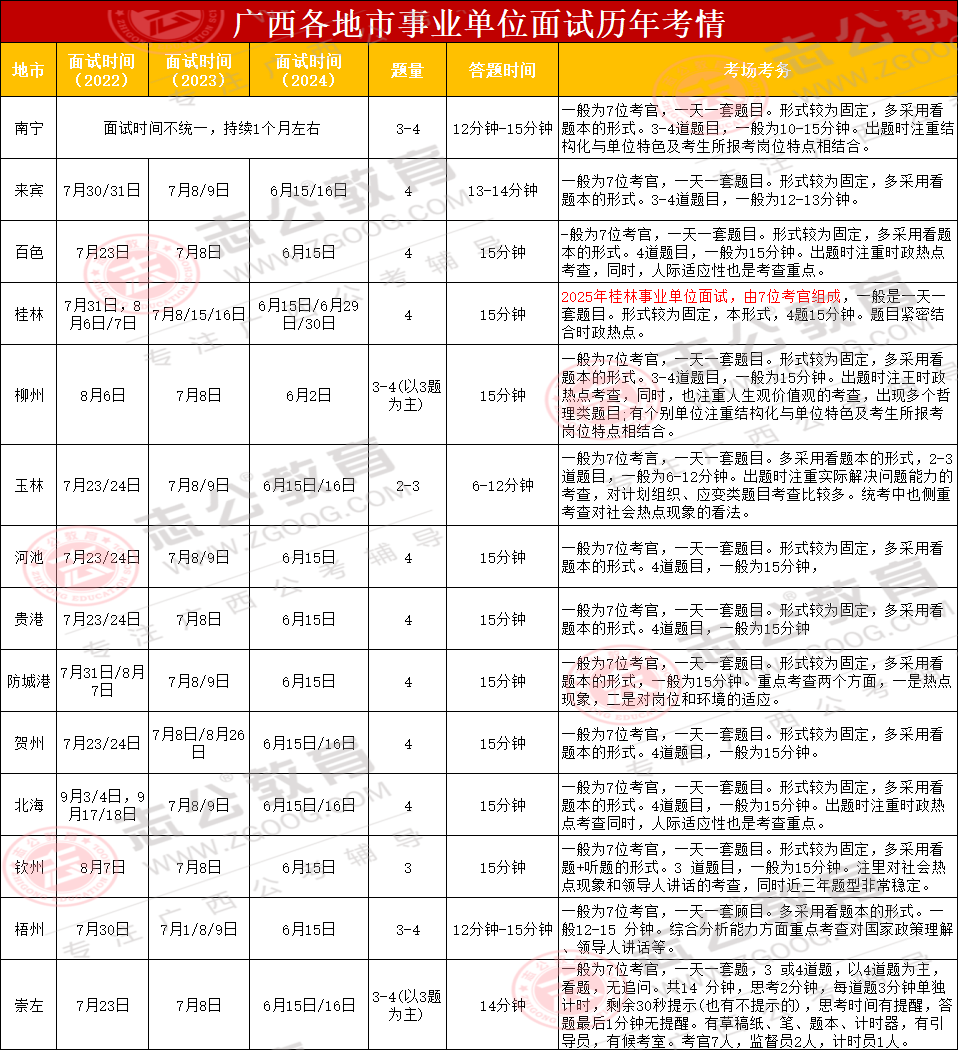 當(dāng)然,我們還可以根據(jù)歷年廣西事業(yè)單位面試時(shí)間參考,推測(cè)全部地市是不是集中面試,小志給大家整理了歷年廣西各地事業(yè)單位面試時(shí)間、題量、答題時(shí)間、考場(chǎng)考務(wù),大家可以從下圖看出。