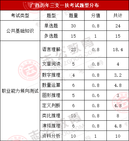 上篇我們寫到,三支一扶的待遇,在廣西這個待遇還算不錯,政策上的支持也非常好,那么預計這個月月底出公告的三支一扶,啥時候筆試呢?2024年廣西三支一扶筆試時間是7月13日,其筆試科目為《綜合知識》一科,滿分100分?;谕昕忌幕貞?,綜合知識內(nèi)容主要包括公共基礎(chǔ)知識和行測職業(yè)能力測試兩個科目,而各題型的題量及分值如下圖所示: