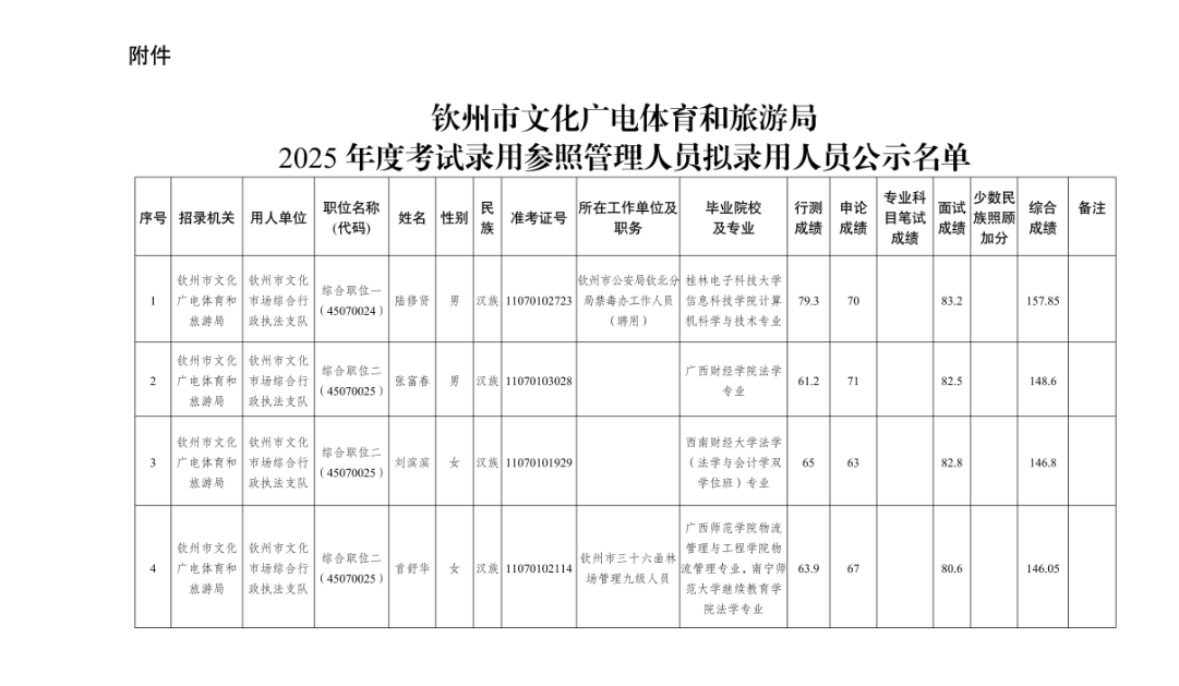 根據(jù)《廣西壯族自治區(qū)2025年度考試錄用公務(wù)員公告》等有關(guān)規(guī)定,我單位2025年計(jì)劃招錄4名參照管理人員,經(jīng)過(guò)公開(kāi)報(bào)名、資格審查、筆試、面試、體檢、考察等程序,擬錄用陸修賢等4位同志(附件)為參照管理人員,現(xiàn)予以公示。公示期5個(gè)工作日,如對(duì)擬錄用人員的錄用資格有異議,請(qǐng)?jiān)诠酒趦?nèi)向欽州市文化廣電體育和旅游局人事科實(shí)名反映。