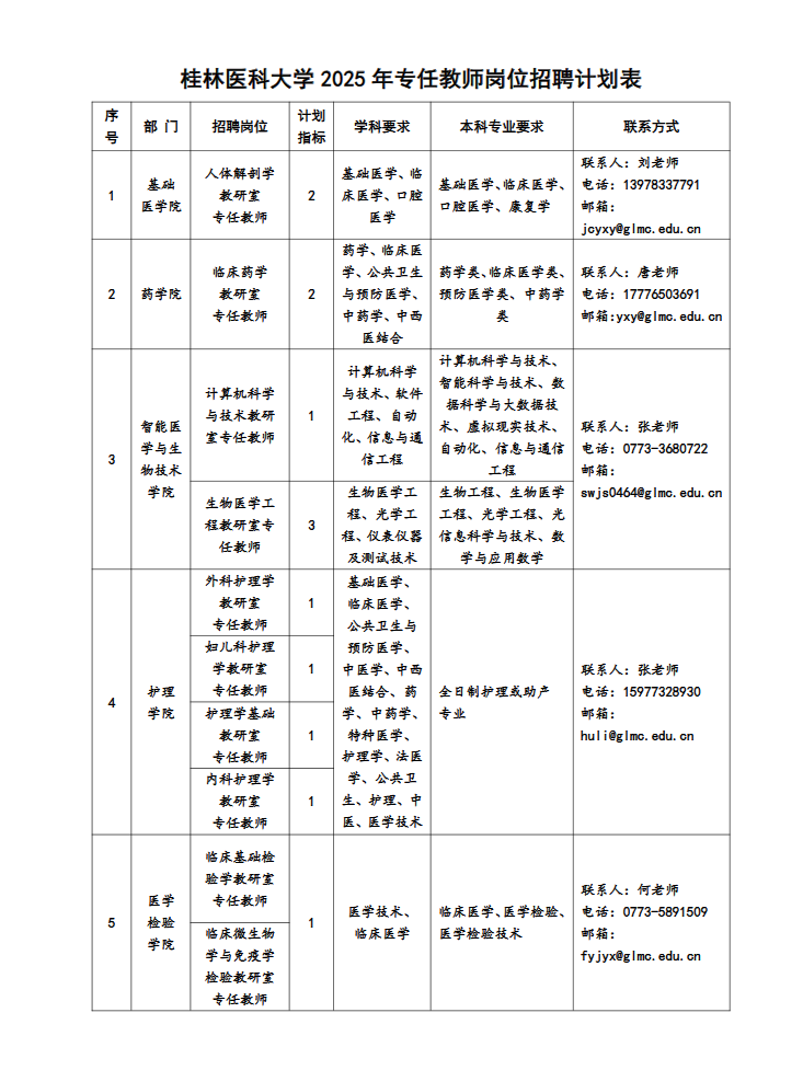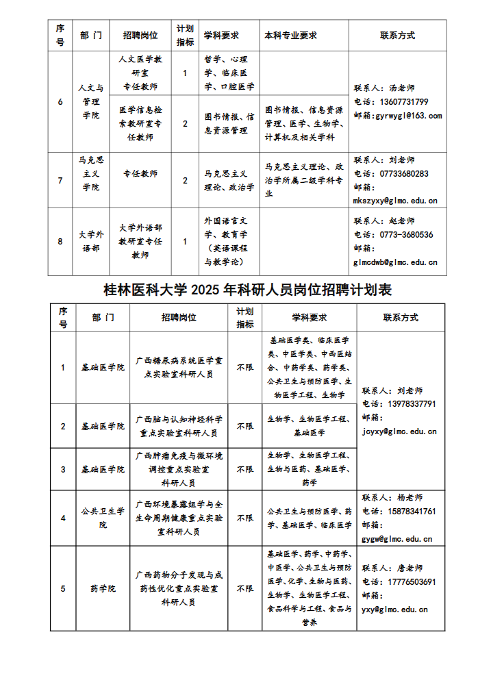 (二)各部門(mén)聯(lián)系方式見(jiàn):桂林醫(yī)科大學(xué)各崗位招聘計(jì)劃表。
