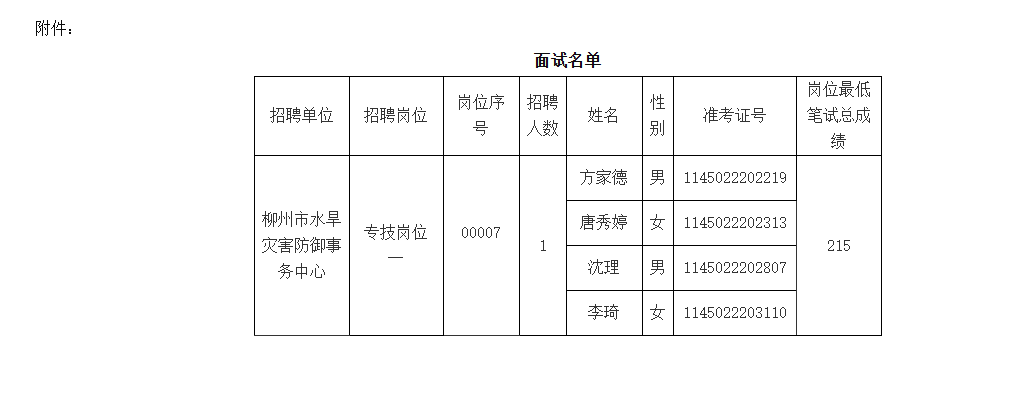 根據(jù)《柳州市2025年度上半年事業(yè)單位公開考試招聘工作人員公告》《廣西壯族自治區(qū)事業(yè)單位公開招聘人員實(shí)施辦法》(桂人社發(fā)〔2011〕155號(hào))、《關(guān)于印發(fā)<廣西壯族自治區(qū)事業(yè)單位公開招聘工作人員面試工作規(guī)則(試行)>的通知》(桂人社發(fā)〔2012〕79號(hào))的規(guī)定,柳州市水利局?jǐn)M組織所屬事業(yè)單位公開招聘工作人員面試,現(xiàn)將相關(guān)事宜公告如下: