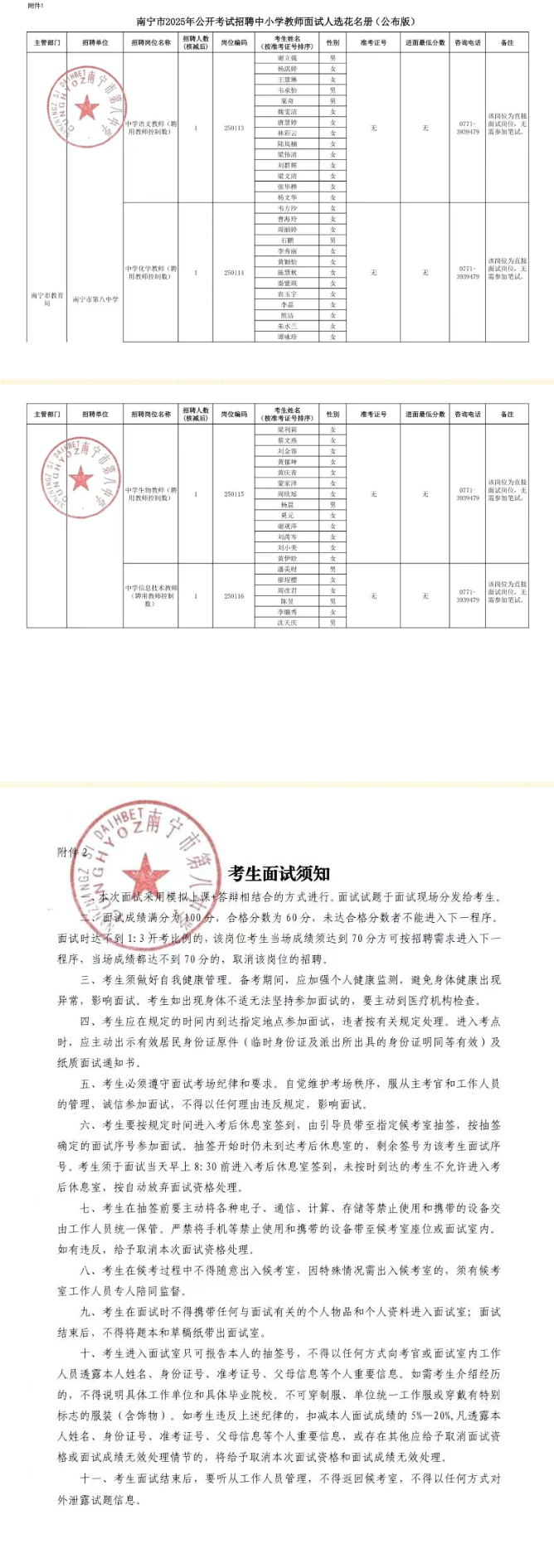 附件:1.南寧市2025年公開考試招聘中小學(xué)教師南寧南分市第八中學(xué)面試人選花名冊(cè)
