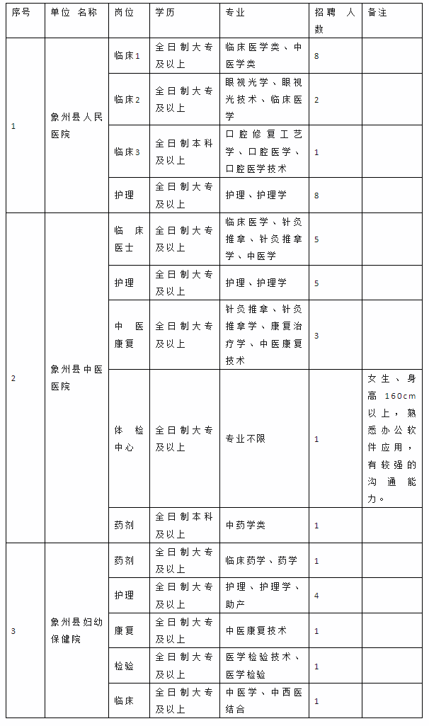 因工作需要,根據(jù)相關(guān)規(guī)定,我單位擬面向社會公開招聘見習(xí)人員42名,其中象州縣人民醫(yī)院19人、象州縣中醫(yī)醫(yī)院15人、象州縣婦幼保健院8人。現(xiàn)將有關(guān)事項(xiàng)通知如下: