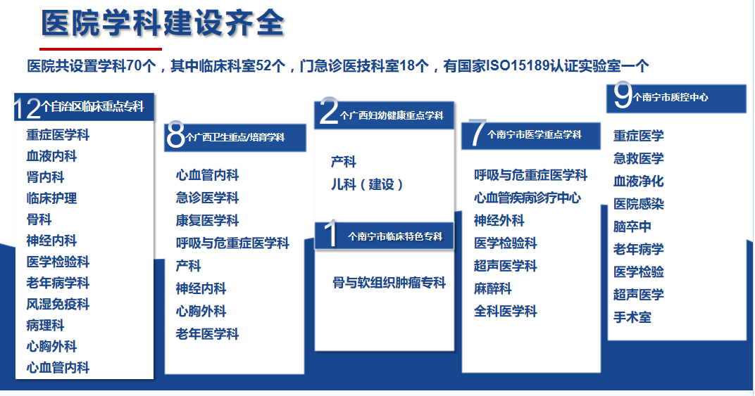 南寧市第一人民醫(yī)院(南寧市兒童先天性心血管疾病研究所、南寧市呼吸道疾病研究所、廣西醫(yī)科大學(xué)第五臨床醫(yī)學(xué)院、廣西醫(yī)科大學(xué)第五附屬醫(yī)院)始建于1914年,是一家擁有百年歷史的國家三級(jí)甲等綜合性醫(yī)院。醫(yī)院設(shè)有52個(gè)臨床病區(qū),18個(gè)門診醫(yī)技科室,總開放床位1912張(含分院)。醫(yī)院是國家高級(jí)認(rèn)知中心建設(shè)單位及國家神經(jīng)介入建設(shè)中心、國家ISO15189醫(yī)學(xué)檢驗(yàn)認(rèn)證機(jī)構(gòu),國家聯(lián)盟中心認(rèn)證的胸痛中心、卒中中心;擁有廣西臨床重點(diǎn)??疲ê嘤?2個(gè)、自治區(qū)醫(yī)療衛(wèi)生重點(diǎn)學(xué)科(含培育)8個(gè)、自治區(qū)婦幼健康服務(wù)重點(diǎn)學(xué)科(含建設(shè))2個(gè)、南寧市醫(yī)學(xué)重點(diǎn)學(xué)科7個(gè)、南寧市臨床特色優(yōu)勢???個(gè),南寧市質(zhì)控中心9個(gè)。醫(yī)院是國家衛(wèi)健委創(chuàng)面修復(fù)能力建設(shè)和繼續(xù)教育中心教學(xué)基地、國家級(jí)住院醫(yī)師規(guī)范化培訓(xùn)培訓(xùn)基地,廣西醫(yī)科大學(xué)碩士研究生培養(yǎng)基地,同時(shí)是暨南大學(xué)共建醫(yī)學(xué)教育基地、第十批廣西博士后創(chuàng)新實(shí)踐基地;醫(yī)院還具備國家藥物臨床試驗(yàn)機(jī)構(gòu)資質(zhì)(含I期研究室);醫(yī)院醫(yī)學(xué)實(shí)驗(yàn)中心獲批廣西科技廳重點(diǎn)實(shí)驗(yàn)室“廣西智慧精準(zhǔn)醫(yī)學(xué)實(shí)驗(yàn)室”,是南寧市衛(wèi)健系統(tǒng)唯一的省級(jí)重點(diǎn)建設(shè)實(shí)驗(yàn)室。2019年在市委市政府支持下,成立南寧市第一人民醫(yī)院醫(yī)療集團(tuán)?,F(xiàn)有27家成員單位,形成“1+4+22”(中心醫(yī)院+4家二級(jí)醫(yī)院+22家基層衛(wèi)生及養(yǎng)老機(jī)構(gòu))一體化格局,推行“三二一”運(yùn)營管理模式,逐步構(gòu)建全生命周期健康管理鏈。