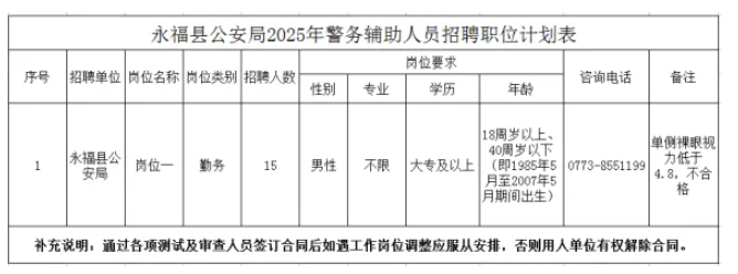 計(jì)劃招聘警務(wù)輔助人員15名。具體崗位、招聘人數(shù)、資格條件詳見《永??h公安局輔警招聘計(jì)劃表》。
