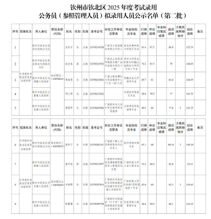 根據(jù)《廣西壯族自治區(qū)2025年度考試錄用公務(wù)員公告》等有關(guān)規(guī)定,經(jīng)過公開報名、資格審查、筆試、面試、體檢、考察等程序,擬錄用吳軒宇等9名同志為公務(wù)員(參照管理人員),現(xiàn)予以公示(附件)。公示期為5個工作日,如對擬錄用人員的錄用資格有異議,請在公示期內(nèi)向中共欽州市欽北區(qū)委員會組織部干部監(jiān)督股實(shí)名反映。
