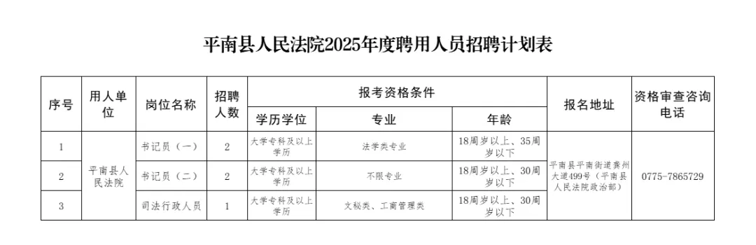 本次招聘崗位為書記員4名,司法行政人員1名。詳見附件1《平南縣人民法院2025年度聘用人員招聘計(jì)劃表》(以下簡稱《招聘計(jì)劃表》)。