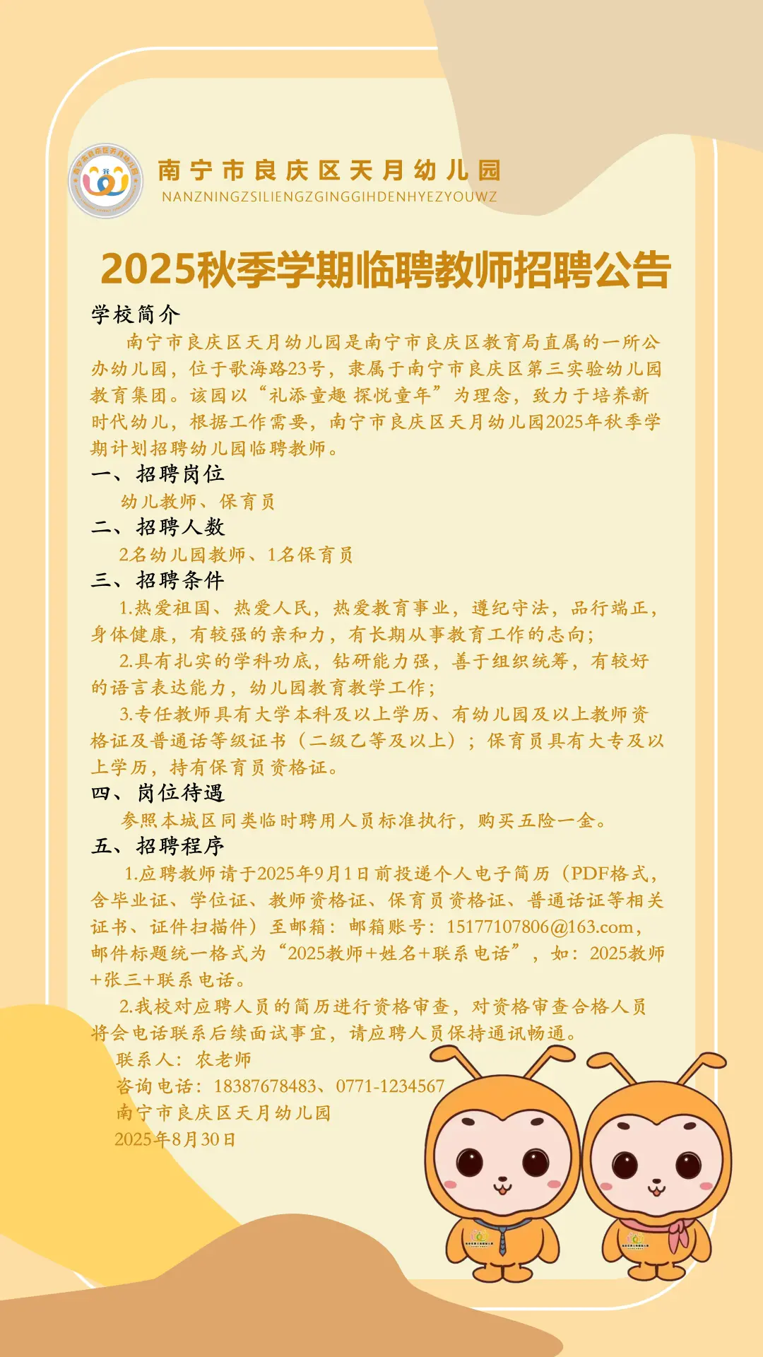 2025年南寧市良慶區(qū)天月幼兒園秋季學期臨聘教師招聘公告
