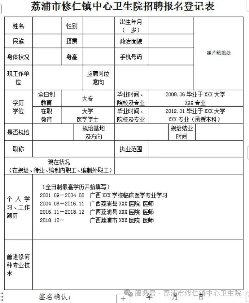 4.現(xiàn)場報名須知:請將簡歷投遞至荔浦市修仁鎮(zhèn)建北街287號,荔浦市修仁鎮(zhèn)中心衛(wèi)生院院辦公室。