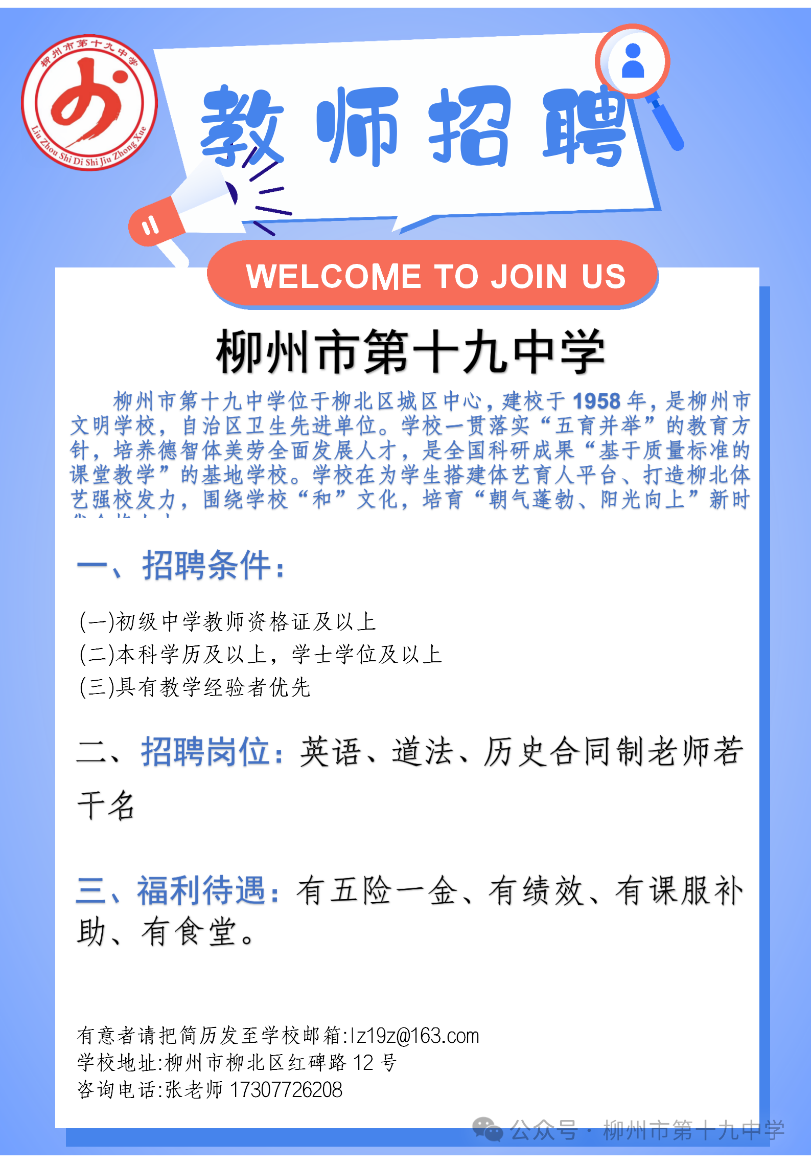 原文標題:柳州市第十九中學合同制教師招聘