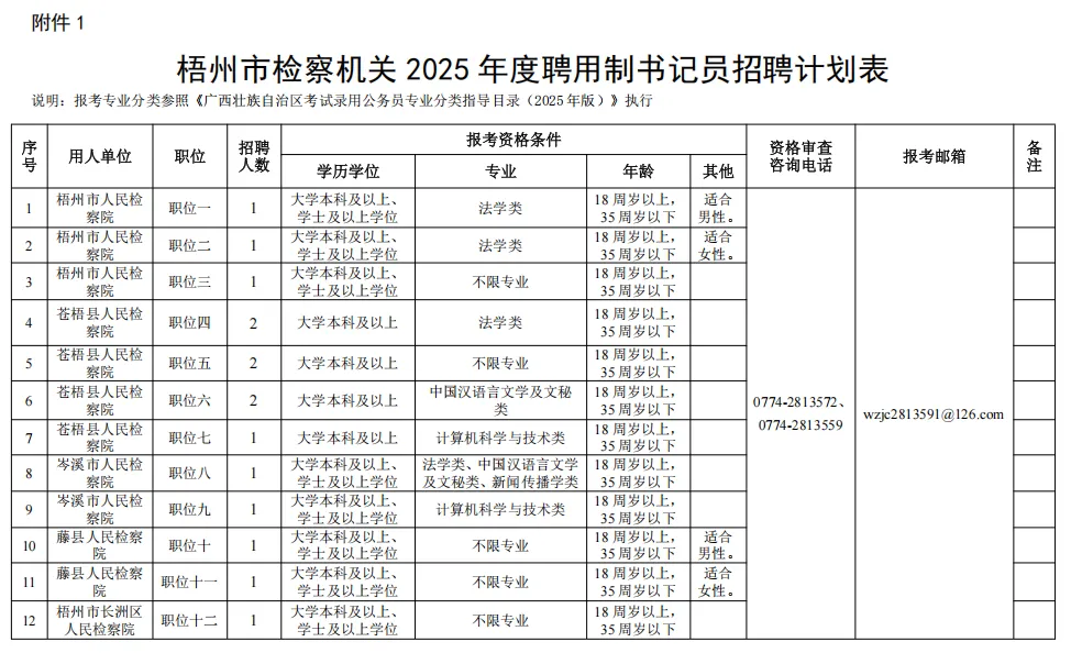 詳見(jiàn)《梧州市檢察機(jī)關(guān)2025年度聘用制書記員招聘計(jì)劃表》(附件1)。
