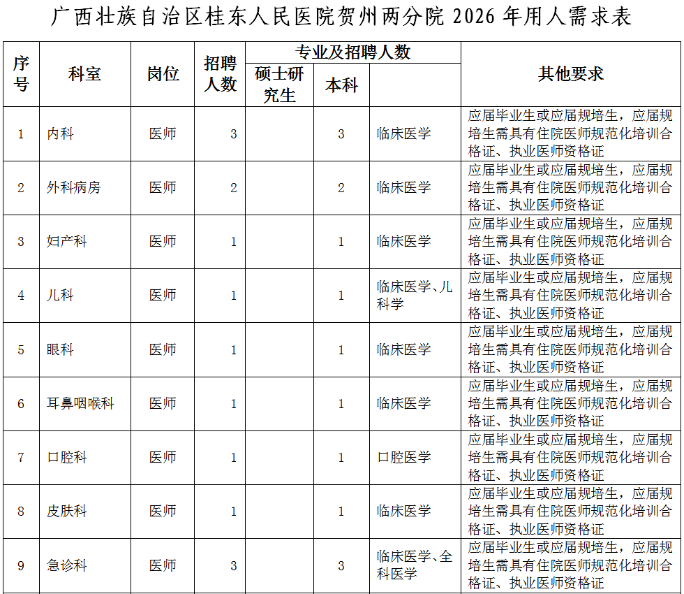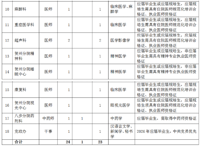 (應(yīng)聘報名二維碼)同時,按以下要求提供個人應(yīng)聘材料(電子版)發(fā)電子郵箱:gdyy2817726@163.com(郵件主題請標(biāo)明:“姓名+賀州兩分院”字樣)。應(yīng)屆畢業(yè)生:個人簡歷、身份證、就業(yè)推薦表、成績單、各種獎項獎勵證書、外語等級證書等。非應(yīng)屆畢業(yè)生:個人簡歷、身份證、畢業(yè)證、畢業(yè)證備案登記表、學(xué)位證、學(xué)位證備案登記表、職稱證、執(zhí)業(yè)證、住院醫(yī)師規(guī)范化培訓(xùn)合格證、工作證明等。報名時所提交的申請材料必須真實、準(zhǔn)確,因報名時提交的申請材料不真實、不完整或錯誤填寫報名信息,造成資格審查、面試資格審查不通過的,后果由報名人員自行承擔(dān)。(2)資格審核。人事科依據(jù)招聘公告和用人需求規(guī)定的資格條件對應(yīng)聘人員簡歷進(jìn)行收集和資格初步審查,經(jīng)招聘工作領(lǐng)導(dǎo)小組審核后,確定符合崗位條件報名人員名單,由醫(yī)院人事科電話或短信通知符合條件人員。(3)考核??己斯P試和面試由人事科負(fù)責(zé)組織實施,協(xié)助部門為醫(yī)務(wù)部、護(hù)理部、科教科以及用人科室,紀(jì)律監(jiān)督部門為監(jiān)察室。逾期未參加則視為自愿放棄。(4)試工。通過考核的非應(yīng)屆畢業(yè)應(yīng)聘人員,須到醫(yī)院試工5天。試工不通過,不予聘用。(5)體檢。體檢工作由廣西壯族自治區(qū)桂東人民醫(yī)院按照有關(guān)規(guī)定統(tǒng)一組織。體檢標(biāo)準(zhǔn)參照《廣西壯族自治區(qū)事業(yè)單位公開招聘人員體檢通用標(biāo)準(zhǔn)(試行)》《廣西壯族自治區(qū)事業(yè)單位公開招聘人員體檢操作手冊(試行)》執(zhí)行。體檢不合格或隱瞞真實情況致使體檢結(jié)果失真的,不予聘用。因體檢不合格空缺崗位的,將按考核的綜合成績,從高到低,順位補充體檢人員。(6)公示和聘用。對擬聘非應(yīng)屆畢業(yè)應(yīng)聘者在全院范圍內(nèi)進(jìn)行公示,公示期為5個工作日,公示期滿無異議按程序辦理聘用手續(xù)。對公示有異議,經(jīng)核實影響聘用的,取消其聘用資格;對反映問題難以核實的暫緩聘用,待核實清楚后按有關(guān)規(guī)定辦理。