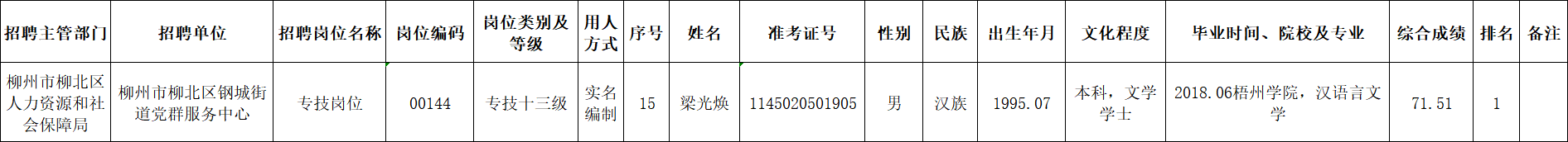 根據(jù)《柳州市2025年度下半年事業(yè)單位公開考試招聘工作人員公告》要求及安排,梁光煥同志經(jīng)面試、考察、體檢合格,符合聘用條件。經(jīng)研究決定,擬聘用梁光煥同志為我區(qū)事業(yè)單位工作人員,現(xiàn)予以公示,公示期為5個工作日(2026年1月22日至2026年1月28日)。對擬聘用的同志如有異議,請以書面形式,并署真實姓名和聯(lián)系地址,于2026年1月28日前郵寄或直接送我單位(地址:柳州市勝利路12-8號柳北區(qū)政府4樓417室;郵編:545002,電話0772-2513360),群眾如實反映有關(guān)問題受法律保護。