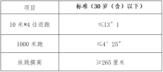 參加體能測評的人員為筆試考試成績合格的考生。體能測評的標(biāo)準(zhǔn),參照《公安機(jī)關(guān)錄用人民警察體能測評項目和標(biāo)準(zhǔn)》的標(biāo)準(zhǔn),具體如下: