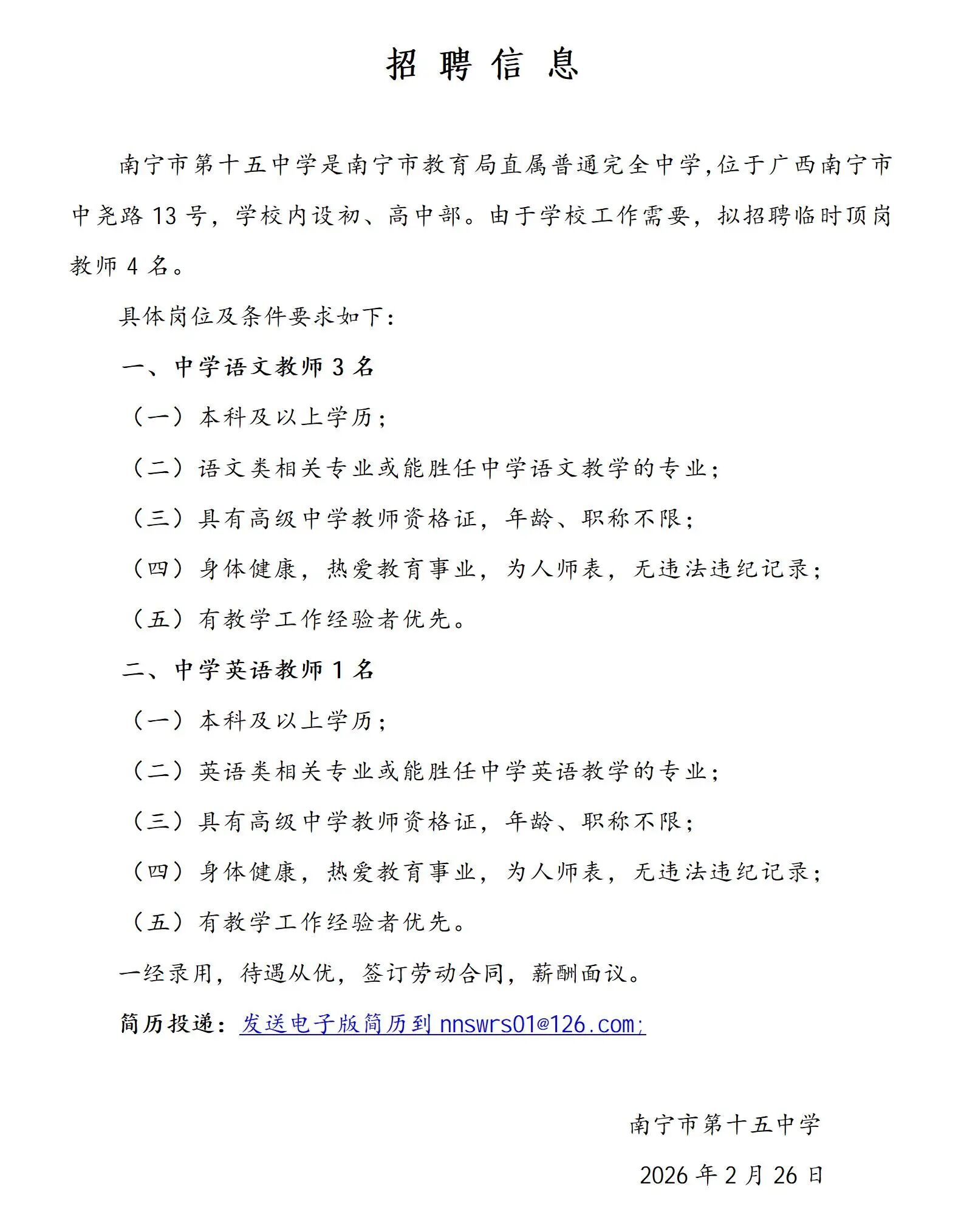 原文標題:2026年南寧市第三十五中學招聘