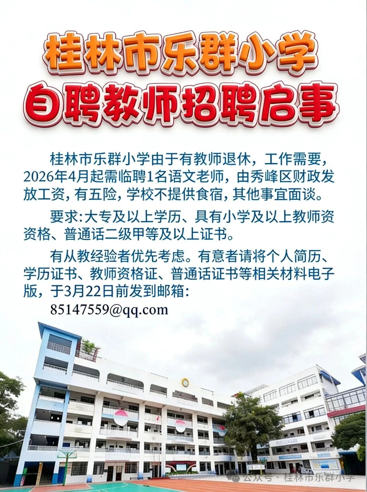 原文標題:桂林市樂群小學(xué)自聘教師招聘啟事
