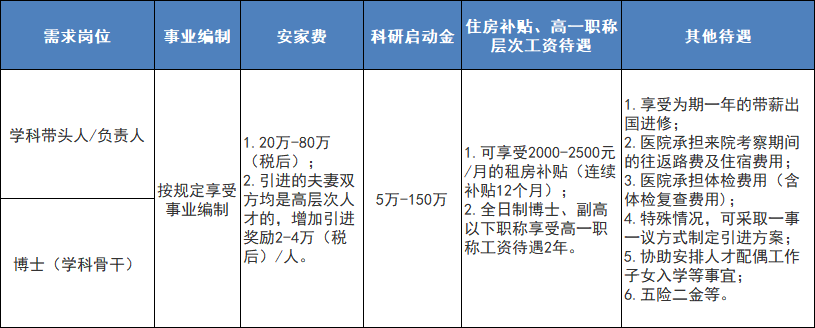 待遇參照國家事業(yè)單位標準或按照醫(yī)院相關(guān)規(guī)定執(zhí)行,根據(jù)不同人員類別給予5萬元至10萬元(稅后)安家補助獎勵,具體內(nèi)容請仔細閱讀招聘公告。